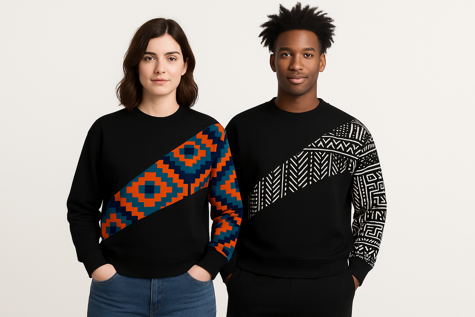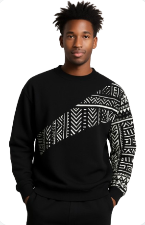 With a sleek black base, a powerful diagonal African print panel, and a fully printed sleeve, this sweatshirt balances strength and culture with modern streetwear aesthetics.